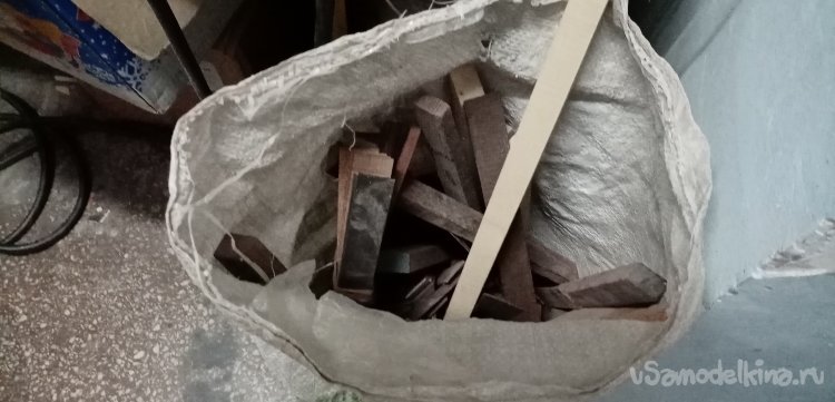 В уголке стоит замечательный мешочек с ценными породами дерева. Высыпаю все содержимое на стол. Есть довольно большой брусок красного дерева. Нужно распустить на пластины по 10 мм, должно хватить на небольшой лесок елочек.