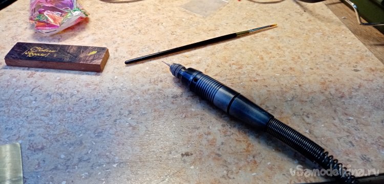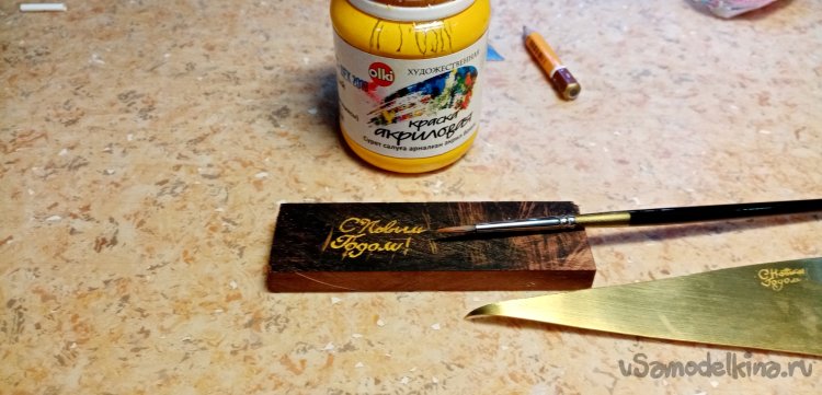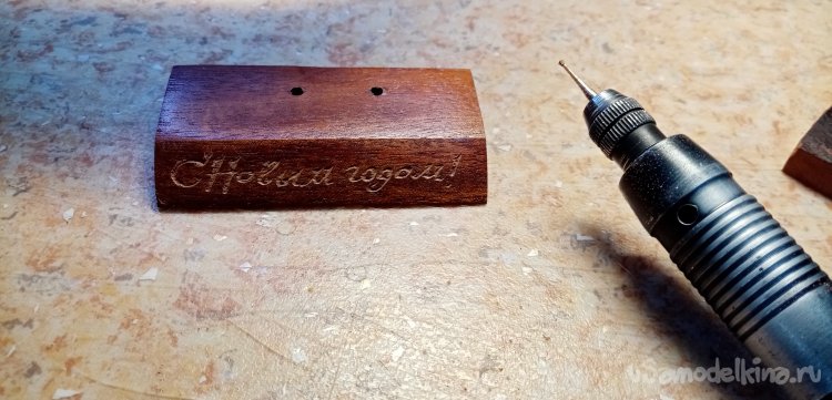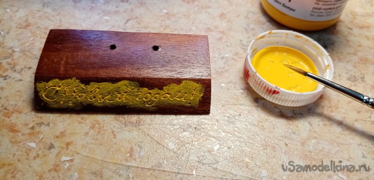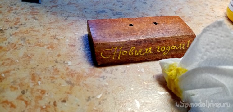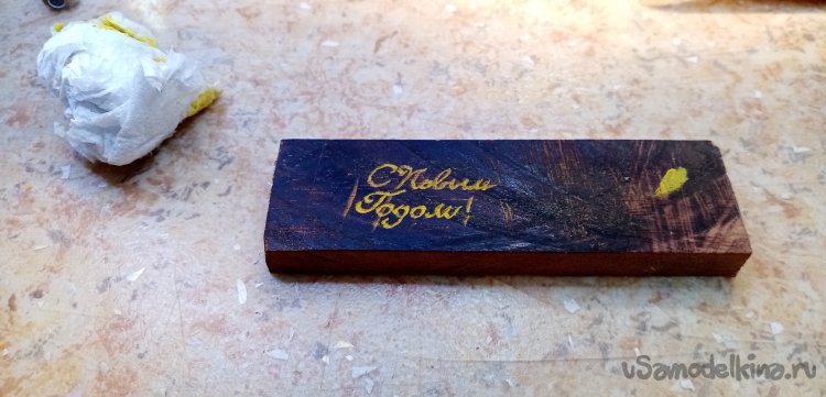 Попробовал надпись на полированной бронзе. Не понравилось. Слишком амбициозно. Следующий вариант просто на дереве. Гравирую надпись, в углубления наношу краску кисточкой. Затем аккуратно подтираю подтеки на плоскости.