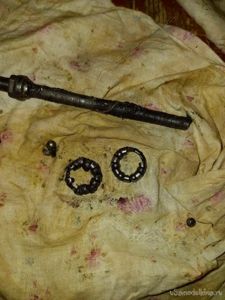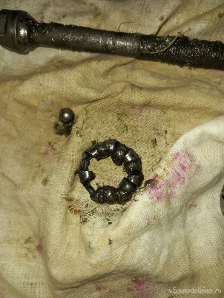 После того как сняли ось видно, что подшипники уже все рассыпались. Это из-за того, что чашечки, по которым ходят подшипники, от пыли, песка и грязи стерлись.