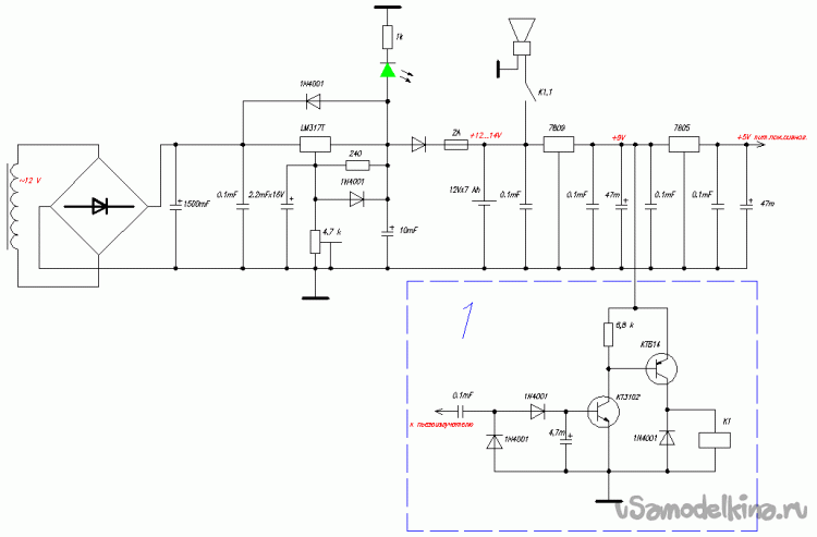 Рис. 2. Схема принципиальная пожарной сигнализации. На схеме не показаны сетевая обмотка трансформатора, соответственно вилка и плавкий предохранитель; магазинная компактная настенная сигнализация. Модуль 1 отвечает за включение громкой наружной сирены по сигналу пьезоизлучателя фабричного модуля. Стабилизатор на LM 317 питает схему и «капельный» заряд буферного герметичного свинцового аккумулятора, стабилизатор на 7809 – схему включения сирены – модуль 1, 7805 – питание китайского модуля-шайбы. Остальное очевидно.