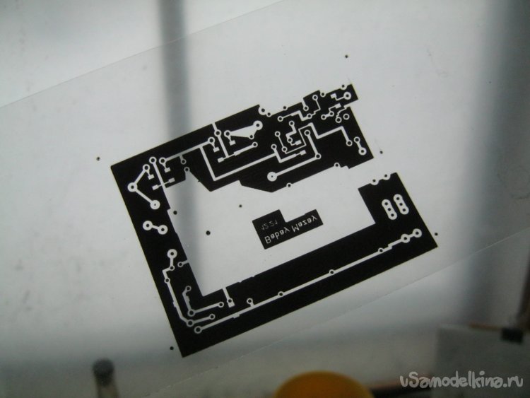 Готовый рисунок крупненько распечатал и проверил с карандашиком соединения, распечатал готовый в натуральном виде, 1:1, на специальной пленке – для струйного, имеющегося в хозяйстве, принтера. Струйная печать не искажает рисунок, он выходит весьма точным, зато получить хорошую плотность фотошаблона, даже при максимально расточительных, в смысле чернил, настройках, сложно. Приходится печатать дважды на одном месте и выбирать минимальное время засветки при печати.