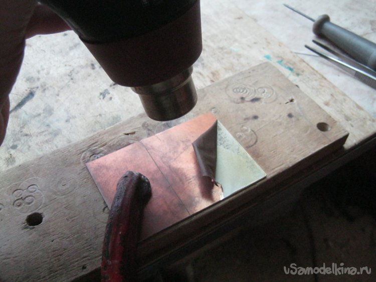 У меня не было под рукой одностороннего материала, а слой меди со стороны элементов не особенно удобен – ненужную фольгу с одной из сторон лучше снять заранее. Заготовку закрепил на рабочем столе, разогрел строительным феном участок фольги, размягчая клей, и поддев уголок ножом, отодрал фольгу пинцетом (Фото 6).