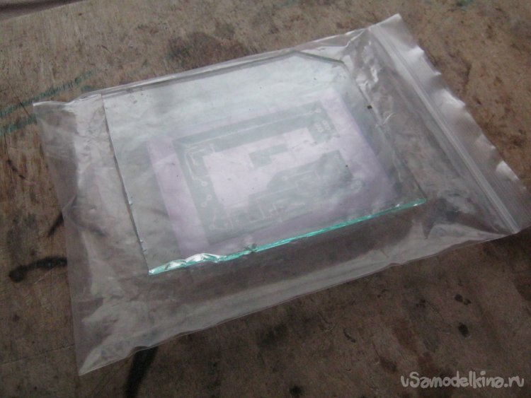 Для контактной фотопечати собрал простейший прижим-бутерброд из частично наполненного воздухом пакета с застежкой-молнией и прозрачного гнета – куска оконного стекла (Фото 9). Такая подушка плотно и равномерно прижимает фотошаблон даже к искривленной очувствленой поверхности и существенно повышает шансы на хороший результат печати.