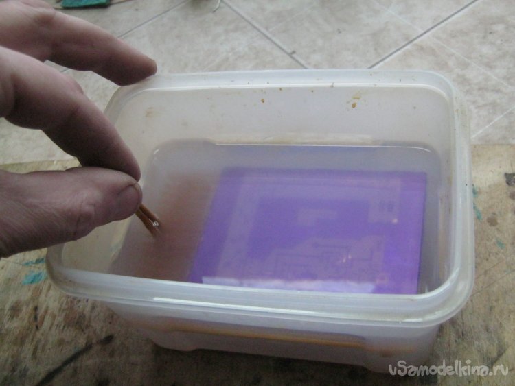 После засветки – снятие второй защитной пленки с фоторезиста и травление защитной маски в растворе кальцинированной соды (Фото 10). Заготовку в растворе вымочить около 5 мин, потом помочь незасвеченным участкам раствориться мягкой кистью.