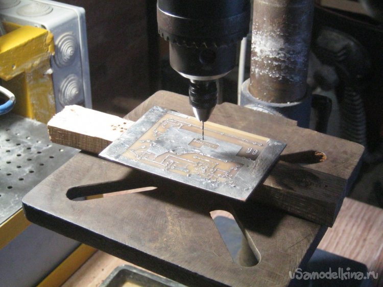 Фото 14. Сверление отверстий ПП. Миниатюрный сверлильный патрон зажат в большом сверлильного станка.