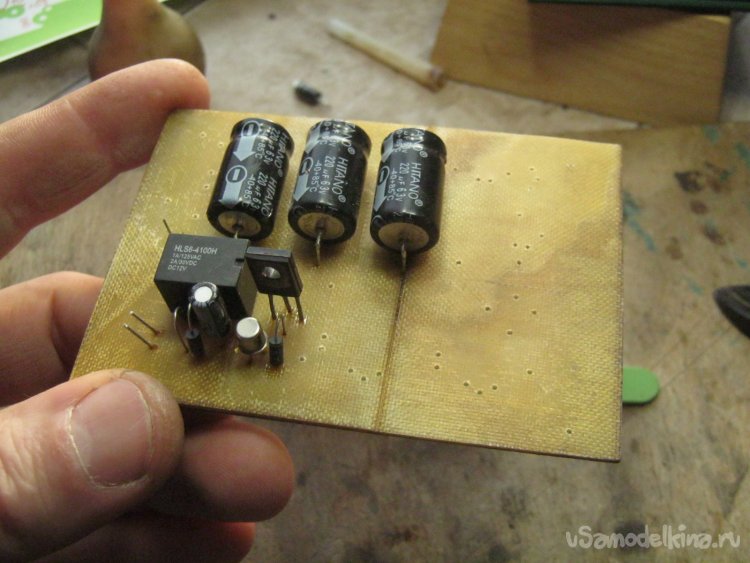Свою печатную плату я проектировал для имеющихся элементов, иногда и в ущерб удобству. Мелкие постоянные резисторы и конденсаторы при этом – SMD типа. Первым делом на плате смонтировал их - паяльником с тонким жалом и нахлобучив очки-козырёк для мелких работ. Следом установил на плату крупные и мелкие выводные элементы, стойки для внешних выводов сделал из кусочков нетолстого медного луженного провода – обмоточного с зачищенной лаковой изоляцией.
