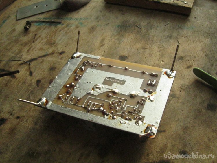 Сформовал проволочные стойки платы по месту, зачистил и залудил с кислотным флюсом места-пятачки внутри жестяного корпуса, отмыл остатки флюса теплой водой. Впаял стойки с собранной платой на штатное место, проверил работоспособность, закрепил на исходном месте.
