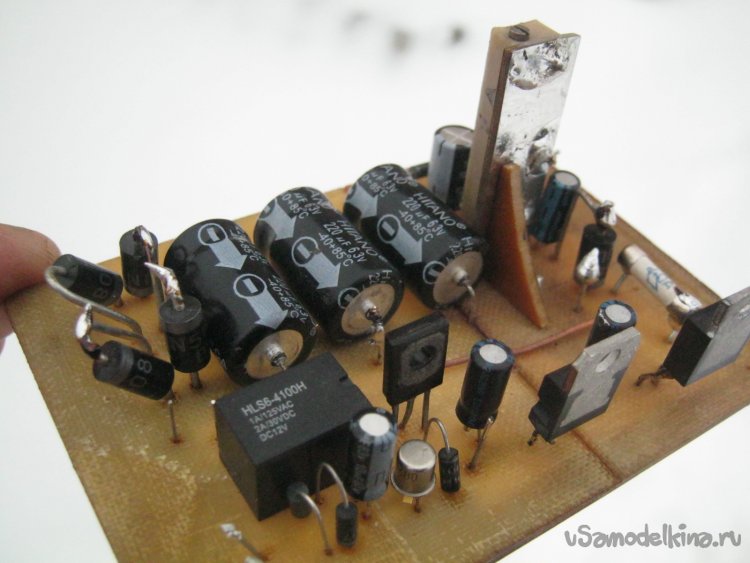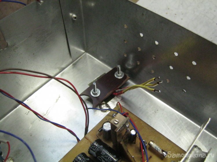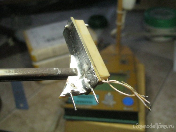 В качестве радиатора самого греющегося стабилизатора применил металлический корпус прибора. Фланец микросхемы должен быть изолирован от общего провода – установил ее через слюдяную прокладку, плюхнув под нее и сверху немного КПТ-8. Прижал текстолитовой планкой с парой длинных винтиков М3 (Фото 21).