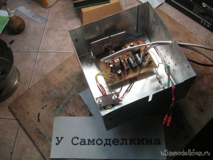 На фланец микросхемы LM317 привинтил временный радиатор – кусочек алюминия. Нетонкий. Подключив к плате трансформатор убедился в наличии трех напряжений на выходах стабилизаторов, подключил аккумулятор, подстроил напряжение на нем (указано на корпусе аккумулятора – «для буферного режима»), для моего 12 В х 7 Аh это около 13,7 В. Подключил питание фабричной сигнализации и остальные провода.