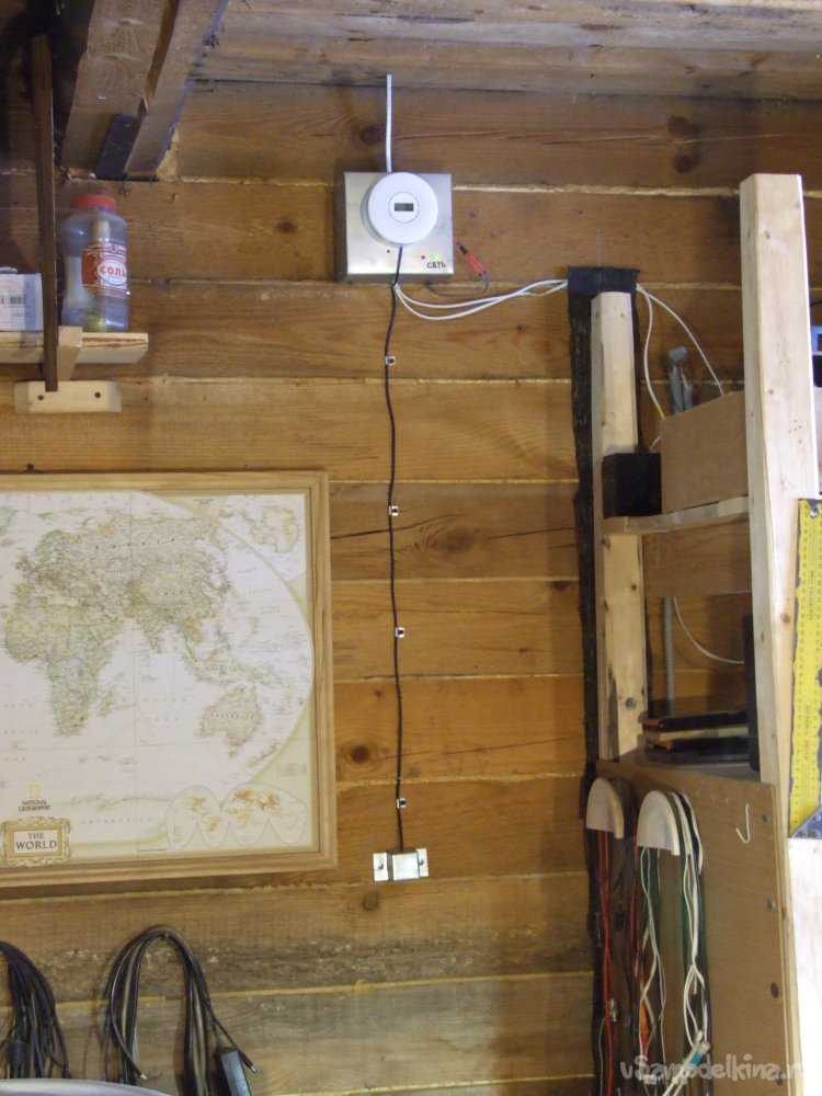 Фото 23. Готовый модернизированный прибор на своем рабочем месте. Внизу в коробочке выносной датчик СО, аккумулятор и трансформатор на полке, громкая сирена выведена наружу под свес крыши.