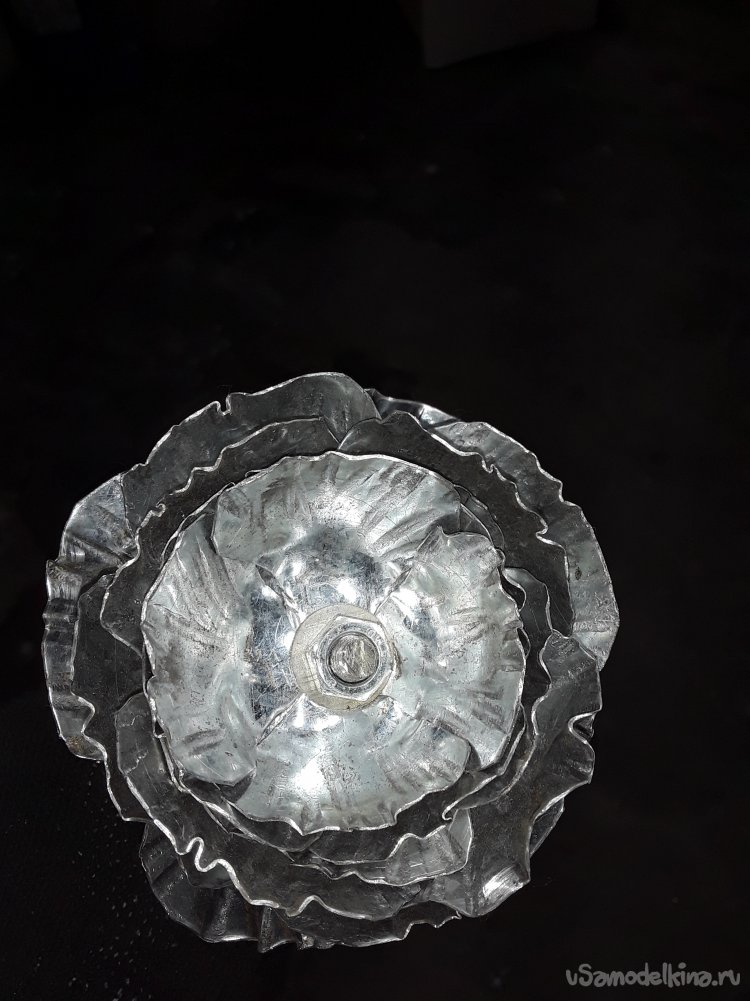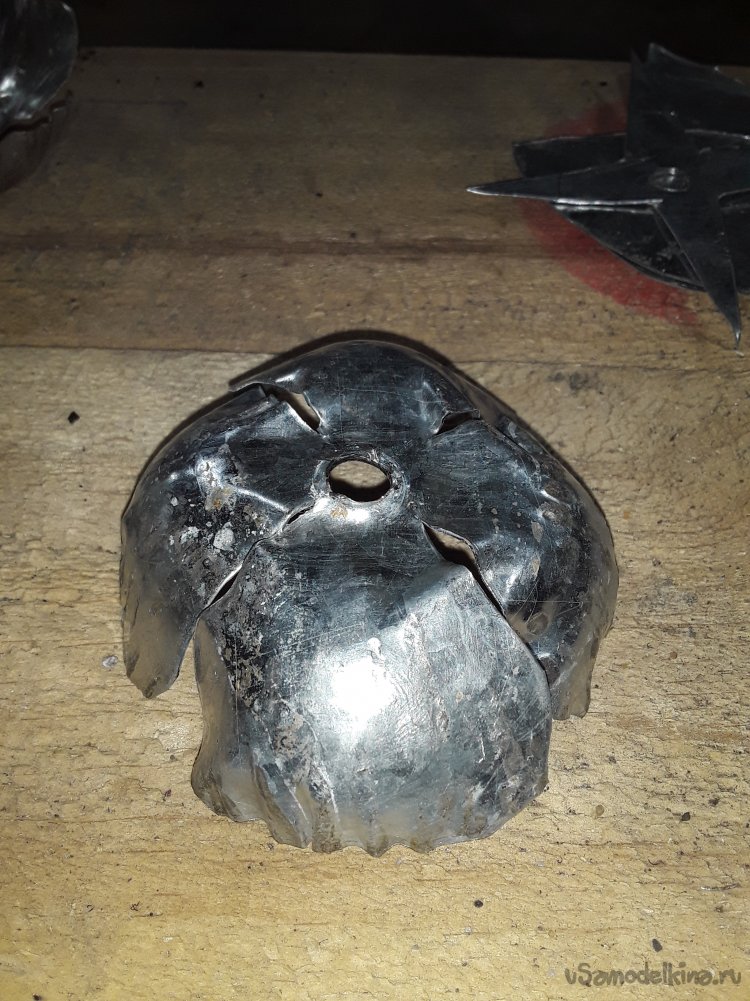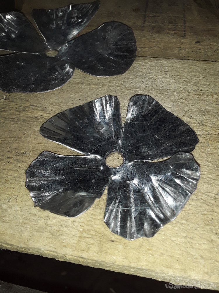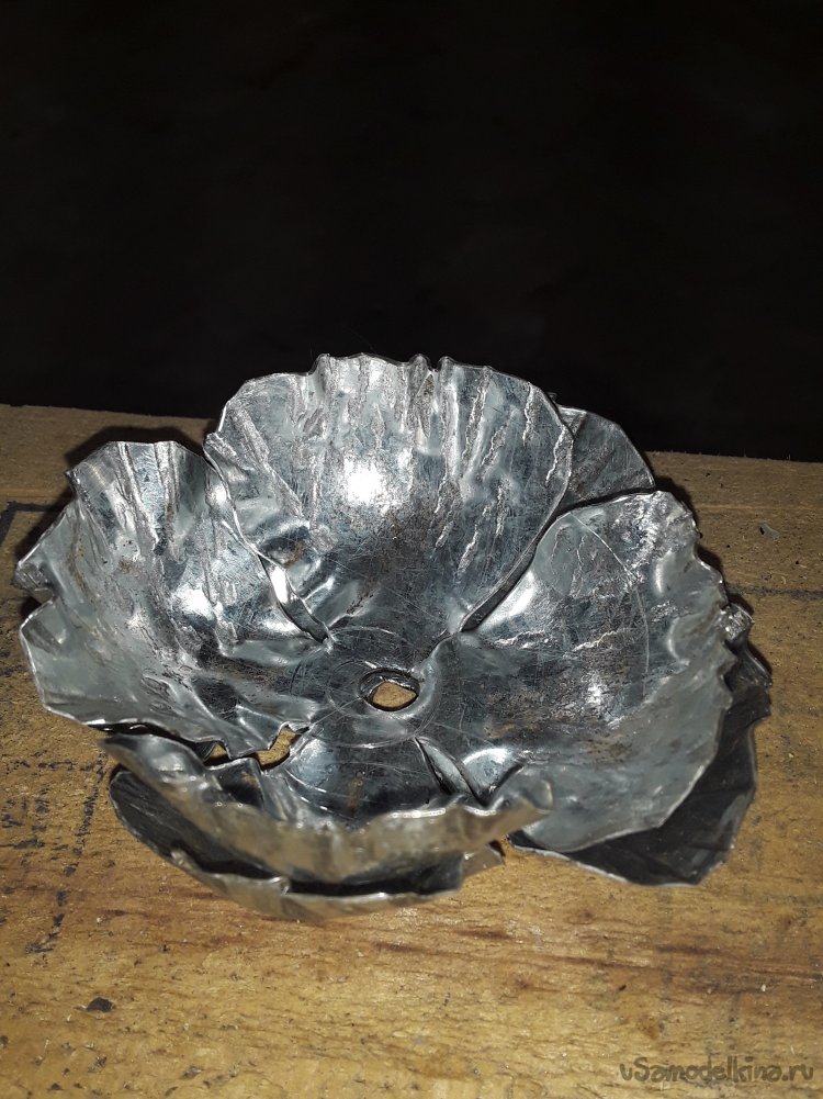 Далее на кругах нужно сделать разметку поделив пополам и в центре просверлить отверстие на 6мм. По разметки прорезаю, но не до конца оставляю 1см от отверстия на всех 6 кругах. Потом нужно по краям закруглить острые края лепестков ножницами ну а потом все пройтись ушм убрав все заусенцы. Для придания фактуры все края лепестков обстучал краем молотка так, чтобы видно было фактуру снаружи на лепестках. Для закругления лепестков использую такое приспособление.
