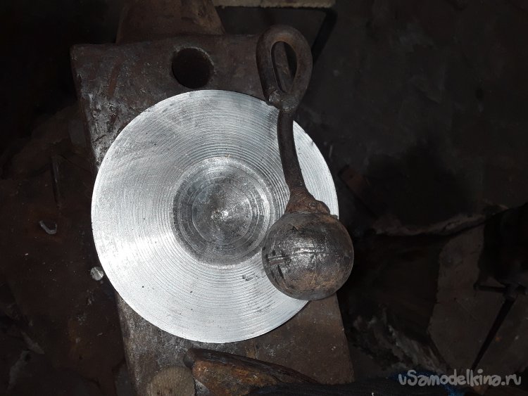Такой штукой я придаю округление заготовкам просто положил лепесток над расточкой поставил шарик и стукнул пару раз вот так все заготовки пробиваю и приступаю к вырезке из металла остальных деталей.