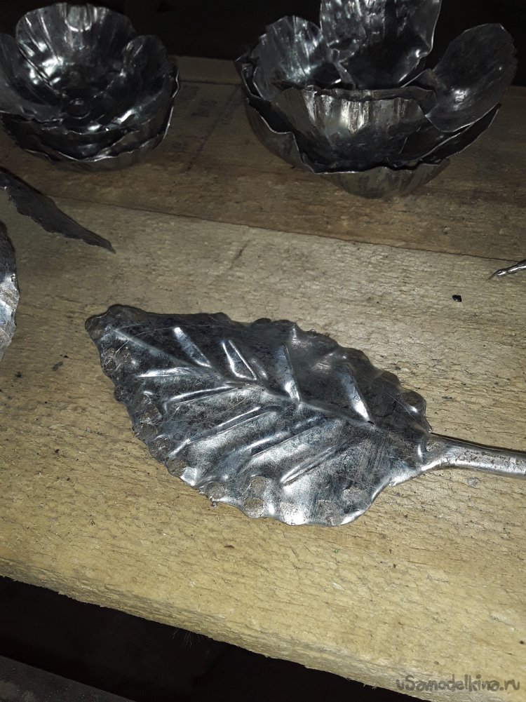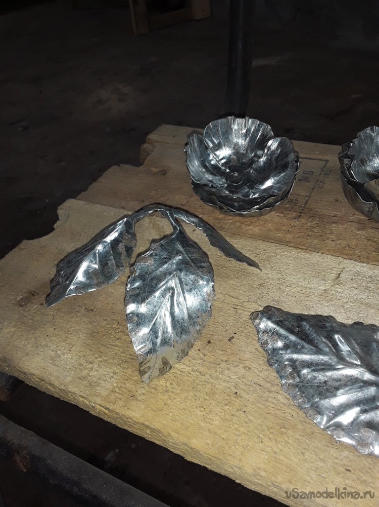 Для того чтобы роза была розой для ее вырезаю листья и не знаю как правильно назвать штуку похожую на звезду. Для придания фактуры листьям обстучал все кроя и сделал прожилки. Их я делал просто положив металл на дерево, и надставив тупое зубила пробивал ту фактуру, что мне нужна. Далее плоскогубцами сгибаю веточки придавая округлую форму. Так же и поступил и со звездой.