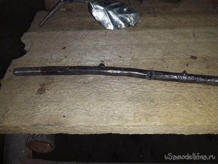 Теперь нужно сделать стебель для стебля взять проволоку 6мм, отрезал 35 см, выровнял на наковальне затем зачистил наждачной. После немного обстукиваю ее молотком так на проволоке будут неровности и будет выглядеть не как проволока. Затем на одном конце нарезаю резьбу 2 см м6 и делаю шипы просто наварив немного металла, а потом болгаркой придаю форму шипа. Ну в тот и все стебель готов лепестки и листья тоже так что приступаю к сборке розы для этого можно использовать газовую горелку ну а я использую горн на угле.