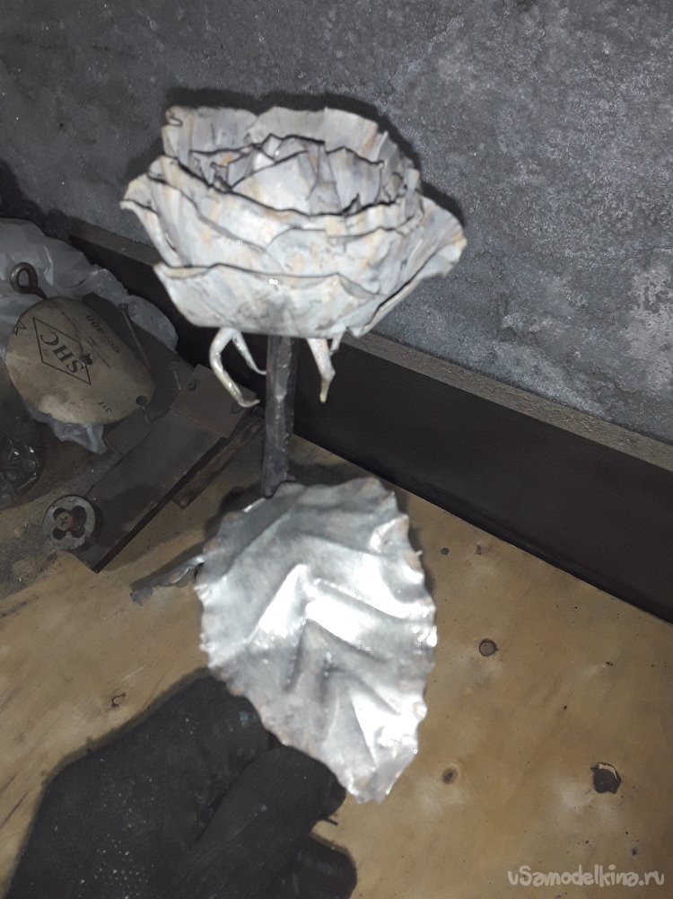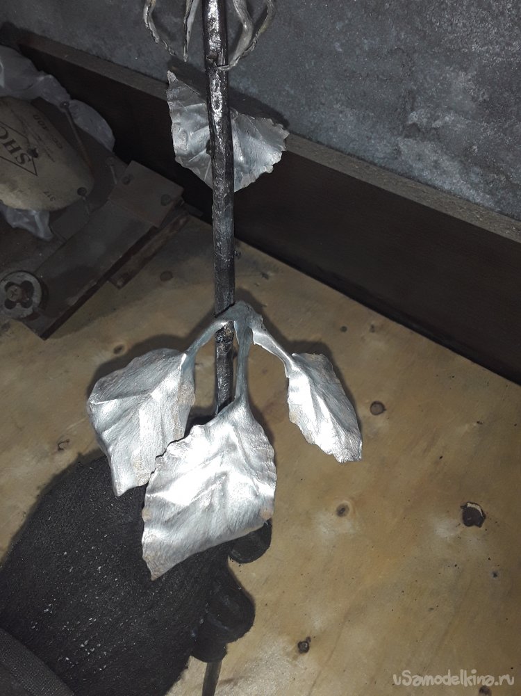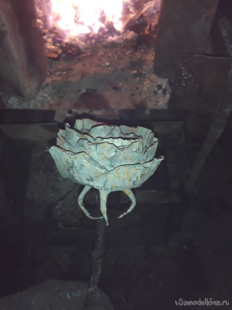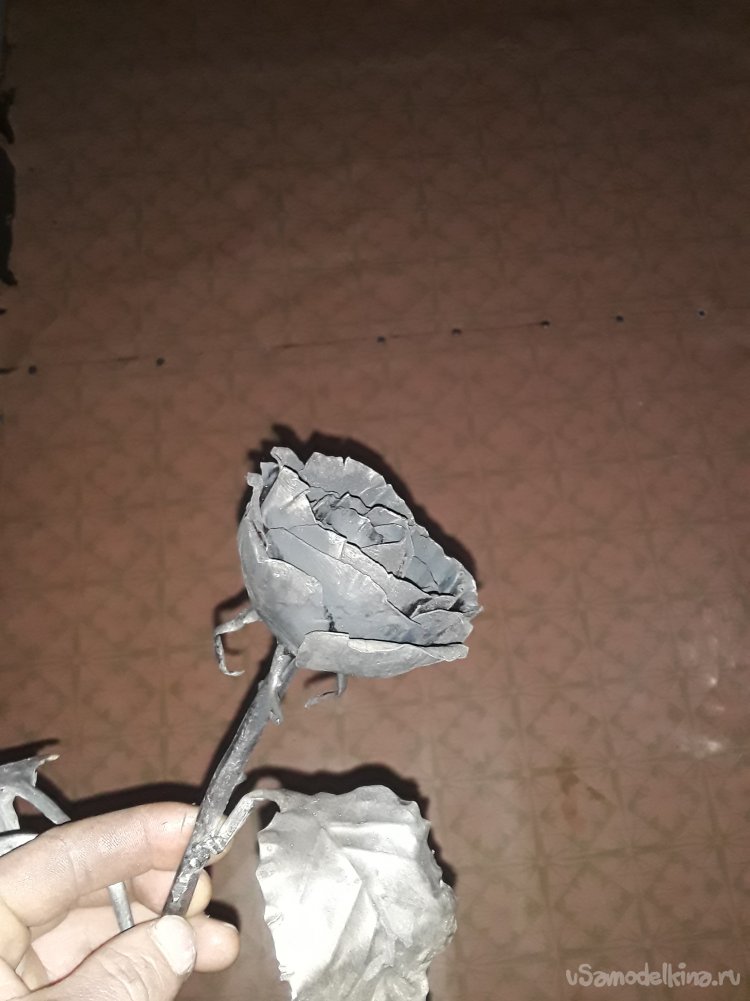 Теперь когда бутон готов привариваю листья к стеблю потом нагреваю все в горне для того чтобы цвет стал ровным и потом черню все в отработанном масле. Ну вот и все роза готова, что получилось то и показываю.