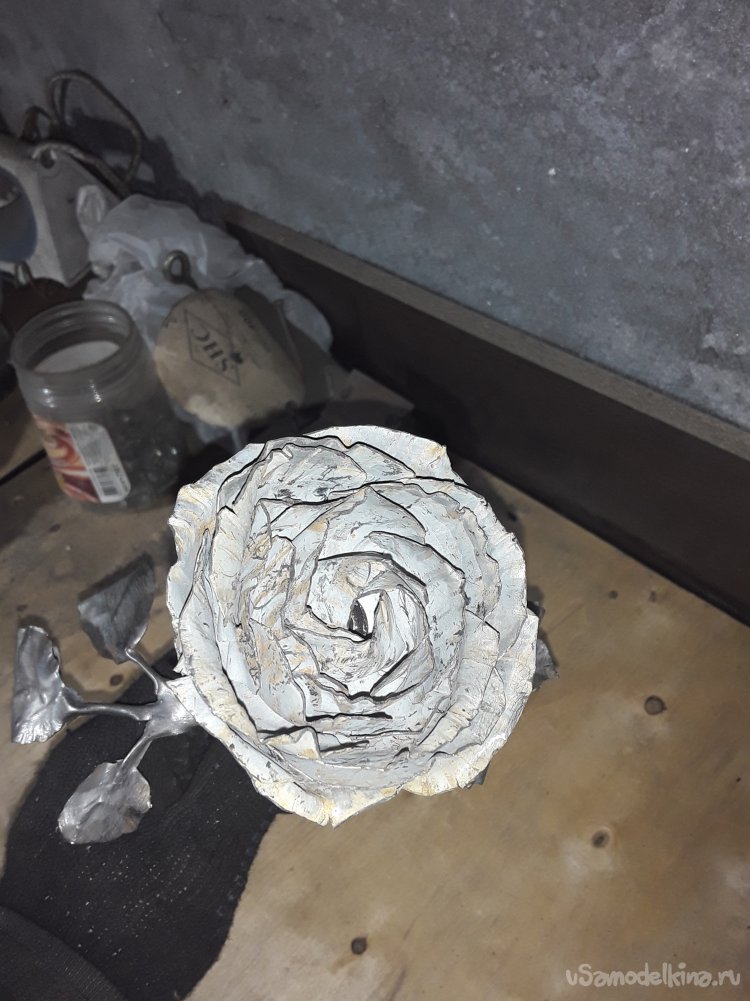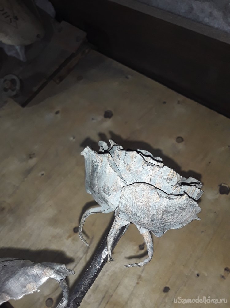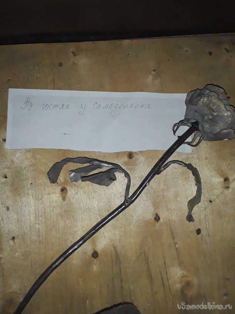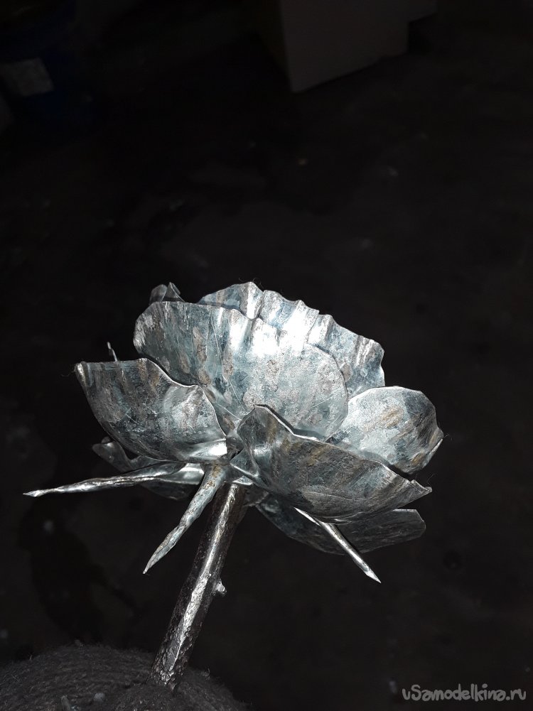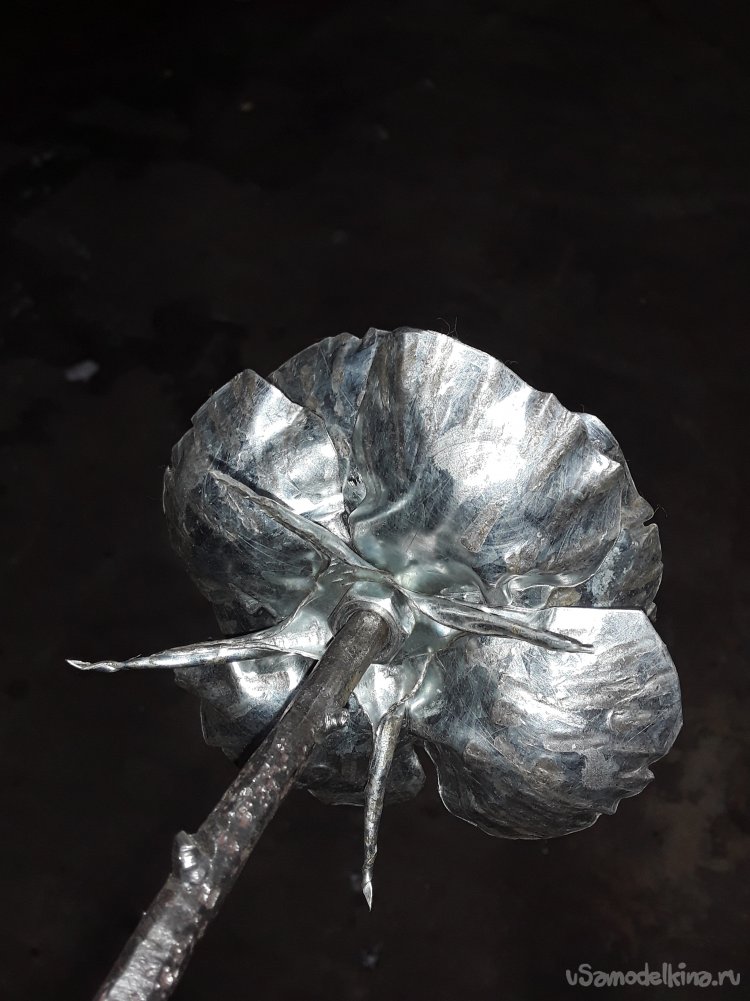 Теперь когда бутон готов привариваю листья к стеблю потом нагреваю все в горне для того чтобы цвет стал ровным и потом черню все в отработанном масле. Ну вот и все роза готова, что получилось то и показываю.
