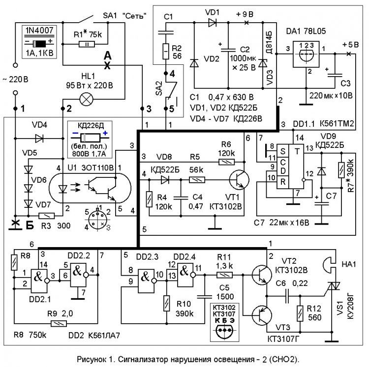 При замкнутом выключателе SA1 СНО2 работает аналогично и вырабатывает громкий звуковой сигнал длительностью 7 секунд при разбивании, перегорании, выкручивании лампы накаливания, а также при обрыве проводов, подводящих сетевое напряжение к лампе HL1. В отличие от режима разомкнутого выключателя, при замкнутом выключателе SA1 «Сеть» дежурный ток протекает через цепь SA1, HL1, диод оптрона U1, R3; а также через силовую обводную цепь VD4 – VD7, шунтирующую диод оптрона U1 и резистор R3.
