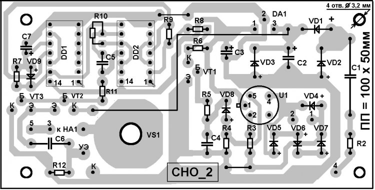 Все компоненты СНО2 (кроме элементов SA1, SA2, R1, HL1) располагаются на ПП (печатной плате) – см. рисунки 2 и 3 - из односторонне фольгированного стеклотекстолита размерами 100 х 50 мм. толщиной 2 … 2,5 мм. С целью уменьшения габаритов ПП с установленными на неё компонентами анод (вывод с резьбой) симистора VS1 рекомендуется укоротить на 5 ... 7 мм. Для этого шайба и гайка М6, прилагающиеся к симистору, плотно накручиваются на анод симистора; гайка зажимается в тиски, и выступающая часть с резьбой аккуратно отпиливается ножовкой по металлу. Резьба восстанавливается двухкратным откручиванием гайки и несколькими полукруглыми движениями бархатного напильника.