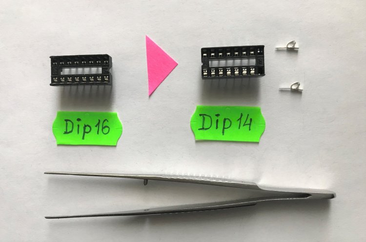 На момент изготовления СНО2 у автора статьи не было в наличии панелек DIP14, поэтому, согласно рисунку 6 нужные панельки были изготовлены из DIP16 простым выниманием 8-го и 9-го гнёздного лепестка. Размещение ИМС на ПП позволяет это сделать без дополнительной доработки ПП.
