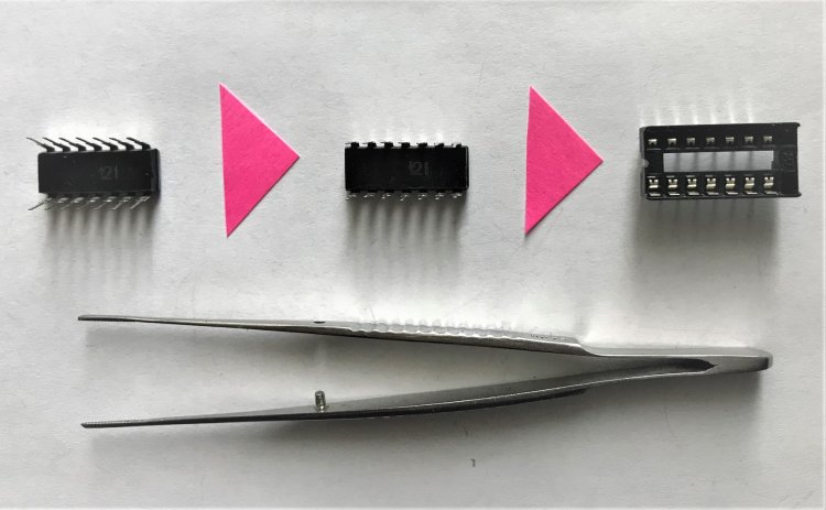 Перед установкой микросхем в сокеты выводы микросхем следует подогнуть пинцетом так, чтобы оба ряда выводов были параллельны. Для этого заземляют пинцет, снимая с себя накопленный статический заряд (традиционно на руку надевают браслет - антистатик) и приступают к «работе». Впрочем, выводов формуемых ИМС пинцетом и руками можно не касаться. Поступают так: пинцетом ИМС берётся за корпус и оба ряда выводов микросхем плавно, но с некоторым усилием прижимаются к ровной поверхности, например, монтажного стола. Пять + пять секунд и … оба ряда выводов ИМС становятся параллельными!