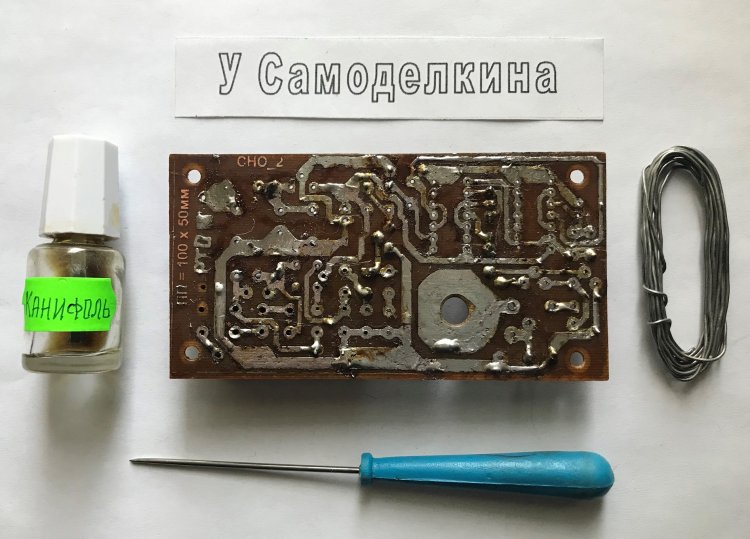 Так выглядит ПП СНО2 со стороны медной фольги. Отверстия, залитые канифолью можно разработать шилом. Желательно иметь шило с трёх или четырёхгранным сечением, но с некоторыми временными затратами подойдёт и круглое сечение.
