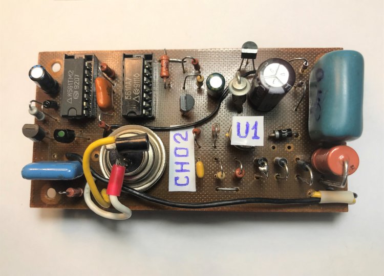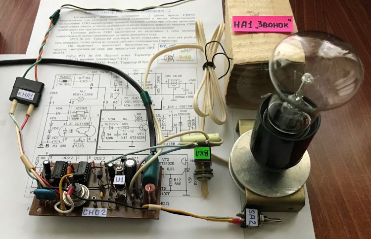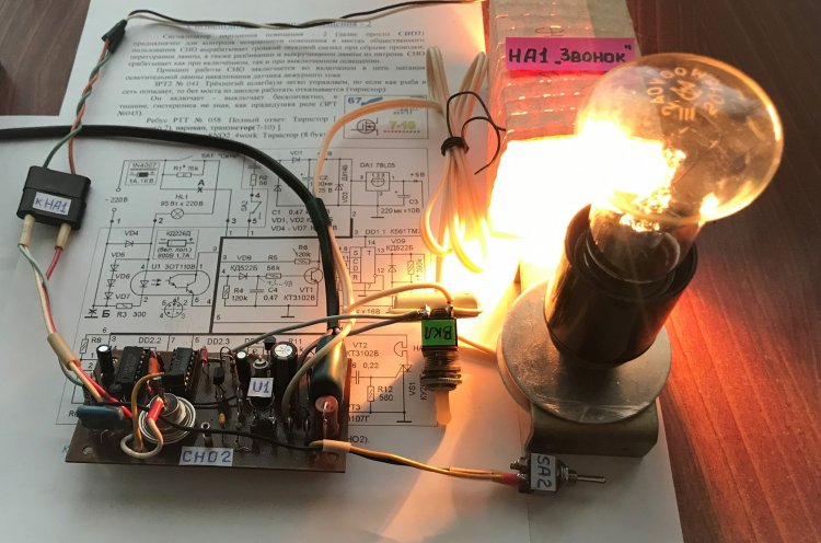 Устройство СНО2 в полном сборе. Примечание: Вместо звонка HA1 установлена лампа накаливания. ПП доработана: на неё дополнительно установлено гнездо – контрольная точка «Общий» для облегчения поиска неисправности.