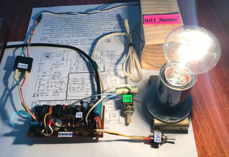 Если не требуется соблюдения особой «конспирации» при установке (подключении к сети ~ 220 Вольт) СНО2, то тумблер SA2 можно исключить (замкнуть). Конструктивно СНО2 рекомендуется установить в месте подвода сетевого напряжения ~ 220 Вольт, а из корпуса устройства вывести двухпроводные линии к местам расположения лампы накаливания (HL1) и выключателя SA1 «Сеть».