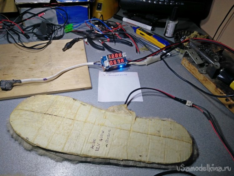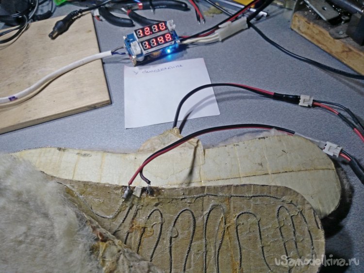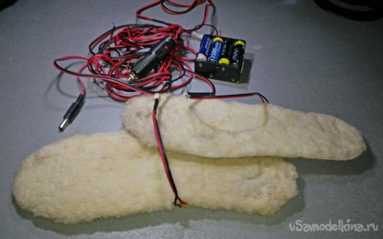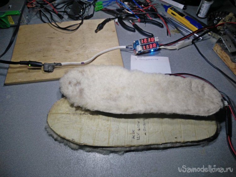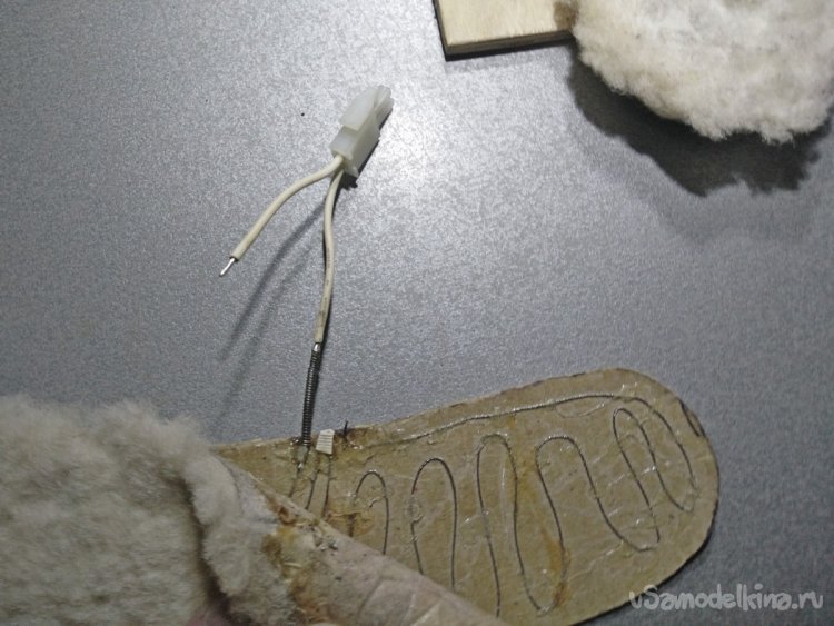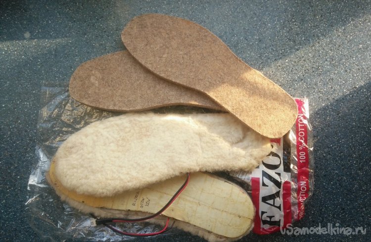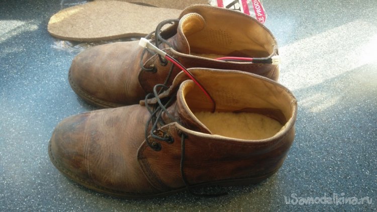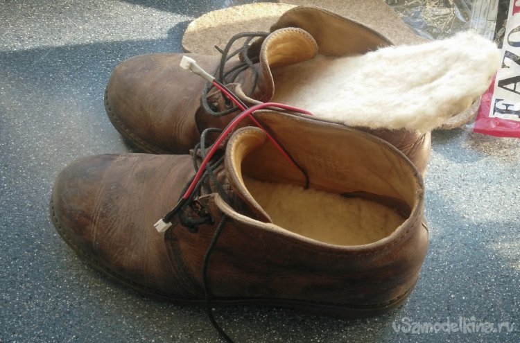 Поэтому при повторении самоделки советую дополнительно заклеить их каким-нибудь герметиком, выдерживающий высокие температуры, например, автомобильным. Также, если обувь позволяет, дополнительные войлочные стельки, расположенные под электрические, не помешают.