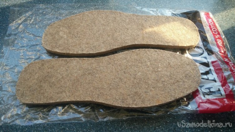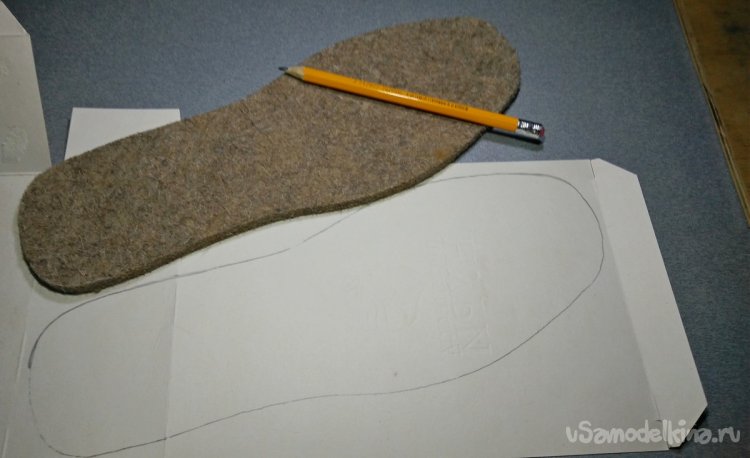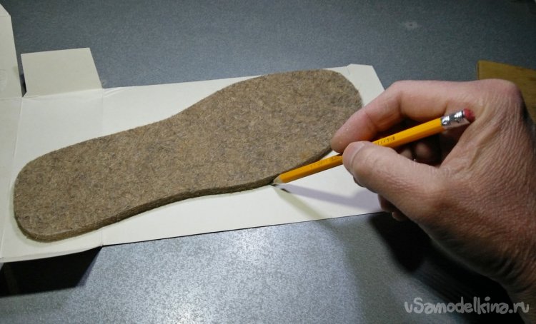 Воспользовавшись готовыми войлочными стельками под ваш размер обуви, нужно перевести контур стелек на картонную заготовку. Для этих целей подойдёт тонкий и плотный картон от ненужных коробок. Так же необязательно покупать новые войлочные стельки, а использовать старые от вашей обуви. Обрисовав по контуру маркером или карандашом будущие картонные стельки, их нужно обрезать по периметру с помощью ножниц или монтажного ножа.