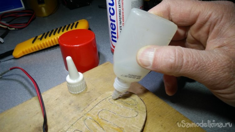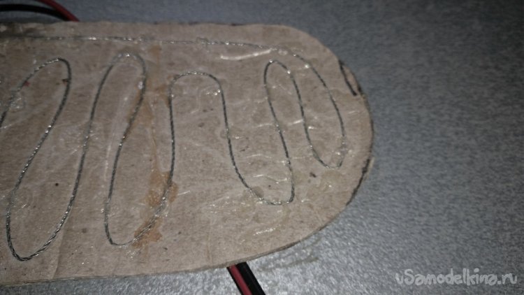 Теперь на картонную часть стельки нужно разместить нихромовую проволоку и закрепить её клеем. Я использовал двухкомпонентный клей. С ним удобнее работать. Сперва наносится клей и размещается провод, а после этого с помощью спрея активатор фиксирует его. Также можно использовать и любой другой клей, который выдержит температуру нагрева нихрома. Термо клеевой пистолет в этом случае не подойдёт.