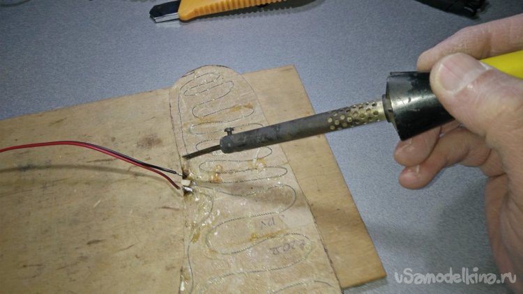 Далее следует подключить нихромовый провод стельки к штекерному соединению для удобства пользования устройством. Для этого следует припаять провода, идущие от коннектора, используя для этих целей паяльную кислоту (ортофосфорную). Также можно воспользоваться обжимными гильзами подходящего диаметра.