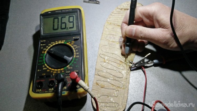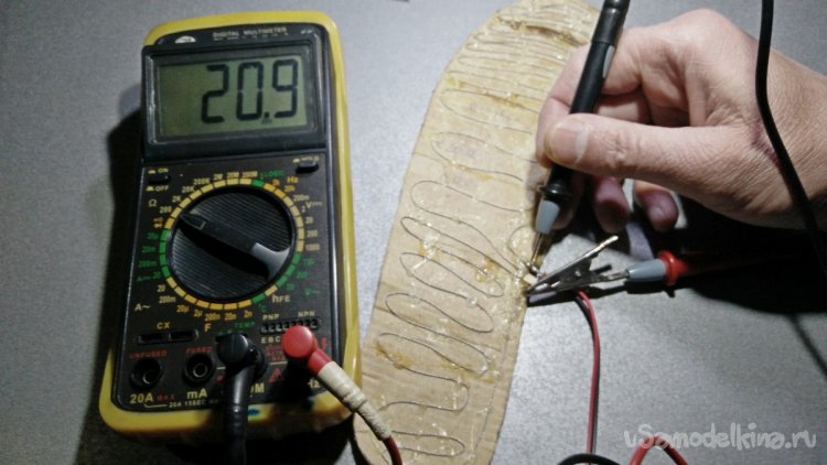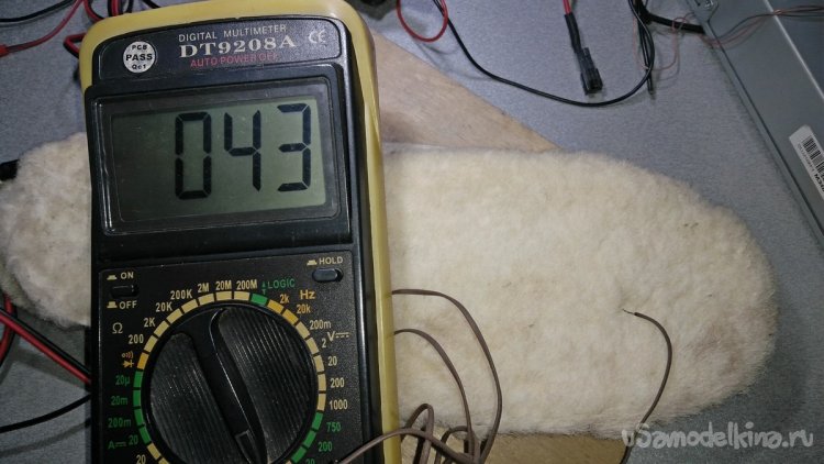 Разделение нужно делать дополнительным выводом проводника посередине. При этом разрезать проводник необязательно, можно его просто согнуть посередине и припаять провода, которые пойдут на аккумулятор. Общую длину нихрома можно определить опытным путём. Всё зависит от сопротивления того провода, который вы найдёте. Также зависит от напряжения аккумуляторов, которые будете использовать. Общее сопротивление проводника стельки у меня вышло в районе 20-21 Ом. Это означает, что мощность нагрева одной ступни примерно равен около 7 Вт (6,85W). Как видно на фото, при испытаниях ток потребления цепи для нагревания двух стелек примерно составляет 1-1,15 А при напряжении 11,5-12 В. В процессе эксплуатации напряжение падает, соответственно, падает и мощность нагрева. Поэтому на аккумуляторной батареи должна присутствовать плата защиты, для того чтобы предотвратить полный разряд и выход из строя аккумуляторов.