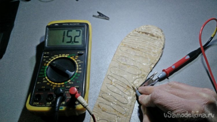 Дополнительно я бы посоветовал закрепить провода с помощью нитки и иголки или небольшими отрезками провода. Это мера предотвратит сползание проводов и, соответственно, короткое замыкание между ними. Разместив в виде серпантина нихромовый провод на стельке, я разделил его на две отдельные части. Таким образом можно включать отдельно верхнюю (14,5 Ом=9.93W) или нижнею (6,5 Ом=22.15W) части подошвы. Я испытывал эту функцию для более быстрого разогрева подошвы, подключая сперва верхнюю часть, а через какое-то время подключал обогрев для всей стельки. Эта функция усложняет всю конструкцию дополнительными проводами и выключателями, поэтому вам её повторять необязательно.