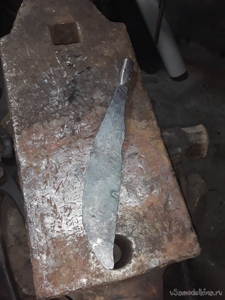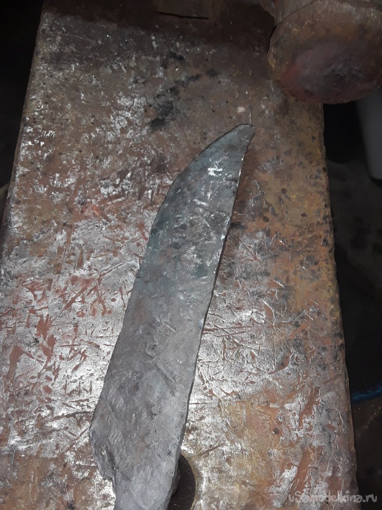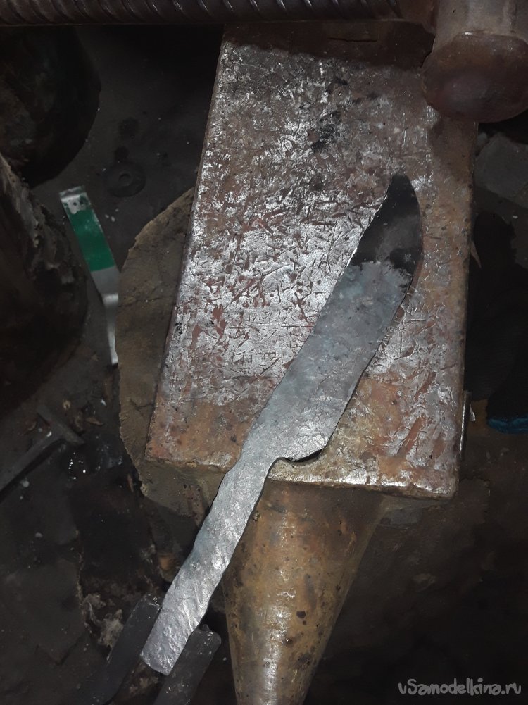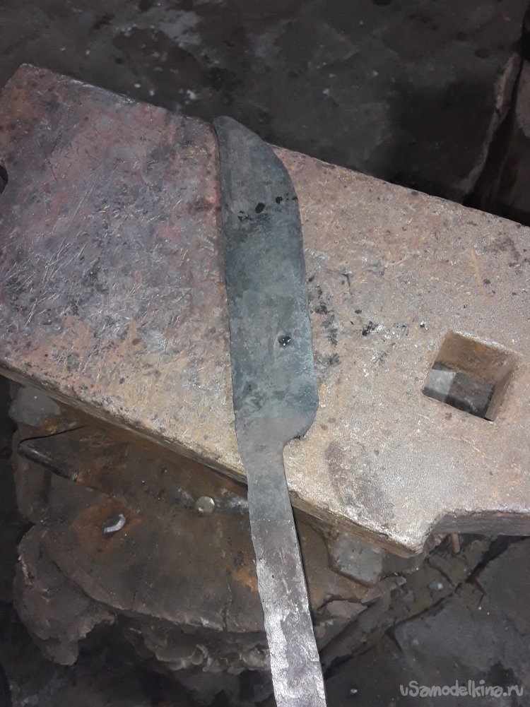 Отмеряю нужную длину и отрезаю болгаркой кусок 15 см далее нагреваю до желтоватого цвета и оставляю на воздухе остывать так клапан потеряет свою закалку. После остывания нагреваю и отковал сначала в полосу вытягивая в ширину когда дохожу до расточки под сухарь отковал форму хвостовика. После того как придал форму хвостовика, отковал кончик клинка. Далее ставлю клеймо, и формирую спуски перед ковкой немного подгибаю клинок в обратную сторону так клинок будет ровнее да и выравнивать ничего не нужно вовремя ковки.