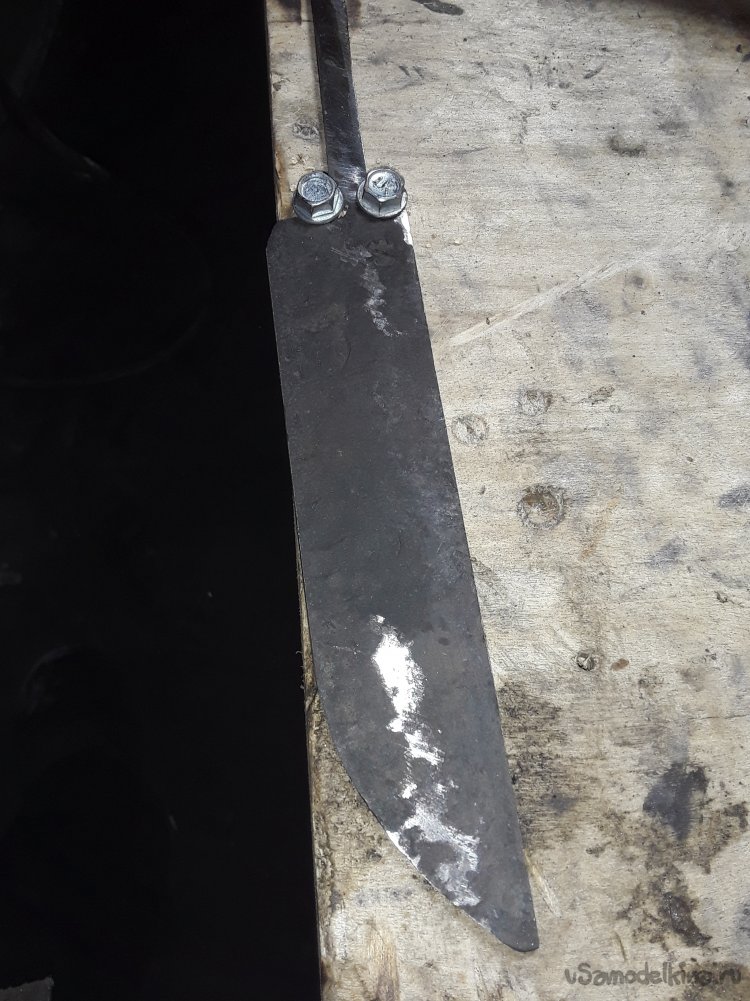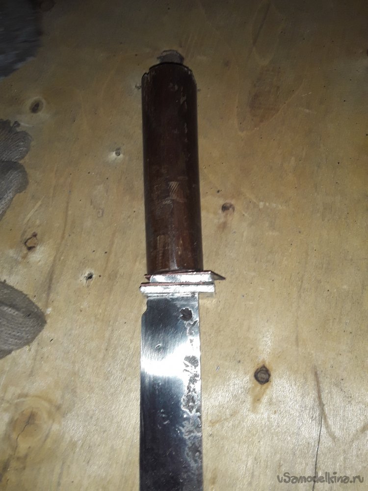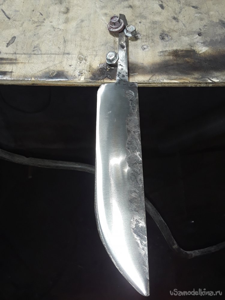 Теперь нагреваю клинок и даю остыть на воздухе так металл потеряет напряжение иначе он будет хрупким. Далее болгаркой отрезаю все лишнее от хвостовика и иду с клинком на закалку.