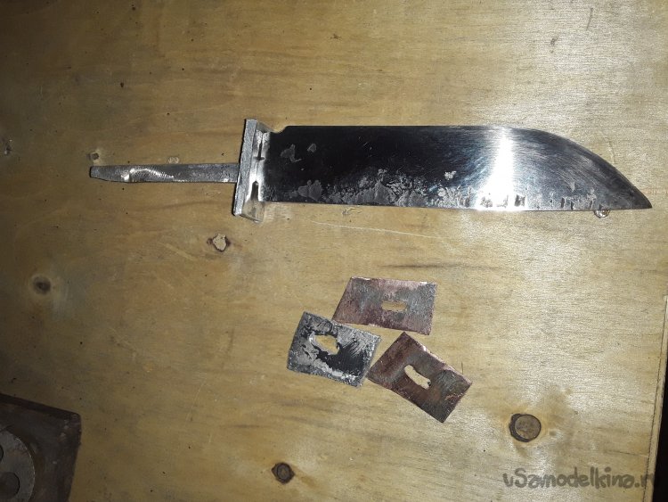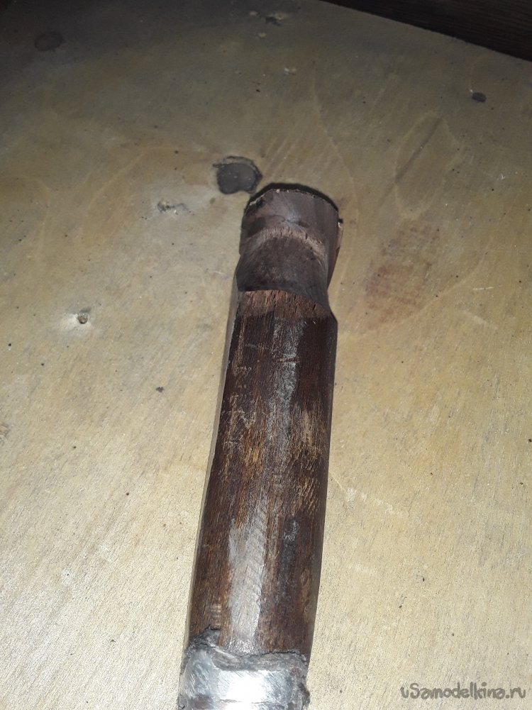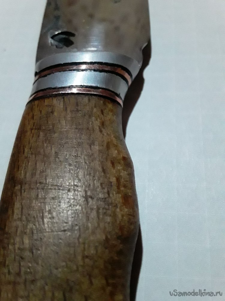 При закалке нужно клинок нагреть до температуры 900°C контроль нагрева осуществляю лазерным термометром после нагрева окунаю клинок в подогретое отработанное масло. Далее даю отдохнуть металлу и через пару часов произвожу отпуск в печи при температуре 300°C в течении 3‐х часов с постепенным плавным остыванием печи. После отпуска шлифую лезвие и приступаю к изготовлению рукояти. Для больстера я взял 2 пластины авиационного алюминия толщенной 4 мм и 2 пластины медные 1 мм толщенной. Между ними фибра черная. Для самой рукояти взял кусок от стула ссср дерево бук. Просверлил в центре отверстие по длине хвостовика потом просверлил и подогнал пластины. И приступаю к склейке рукояти для этих целей использую эпоксидный клей и алюминиевую стружку. Склейку начинаю с набора больстера, а далее наливаю клей в дерево и зажимаю в тиски и оставляю на сутки отвердевать.