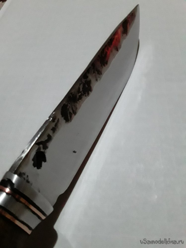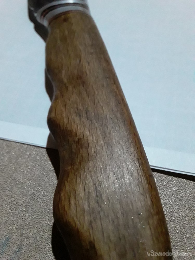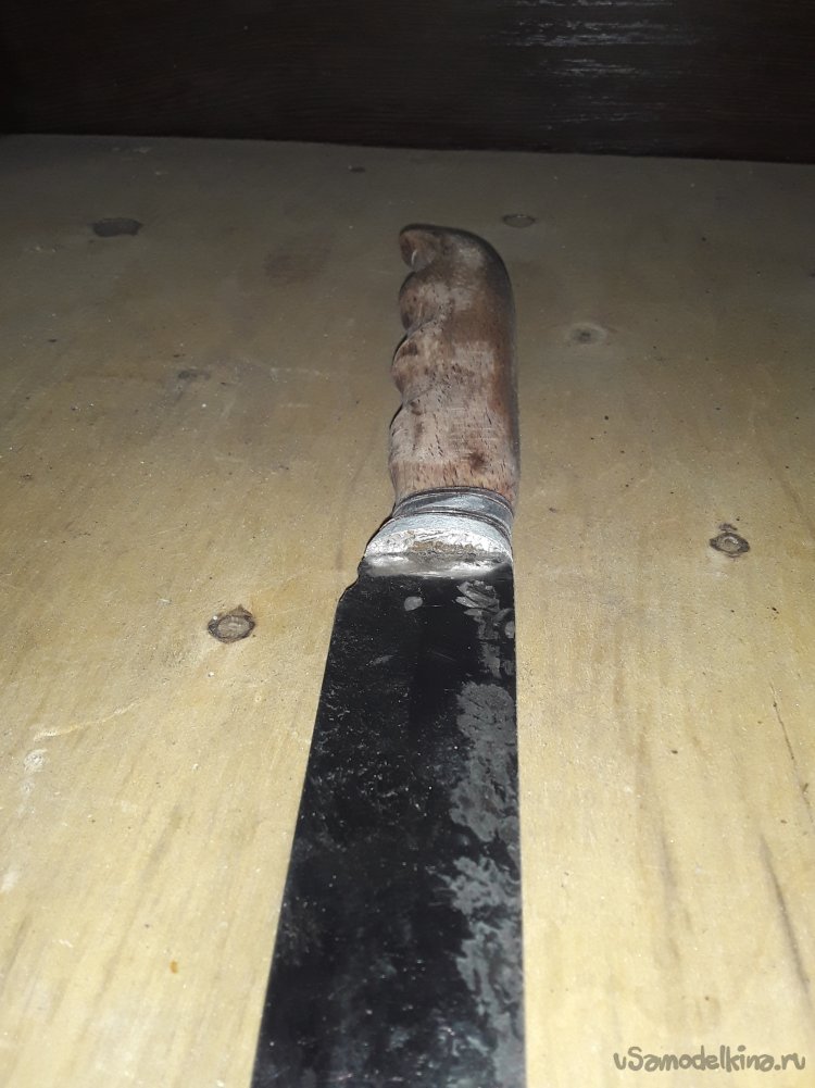 После шлифовки полирую клинок до зеркального блеска и пропитываю воском дерево, а после полирую на войлочном круге на наждаке.