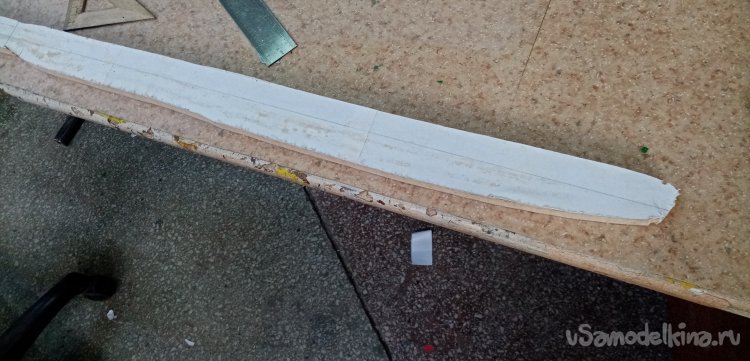 Виктор распечатал на бумаге контур фюзеляжа. Наклеили на плоскость и при помощи электролобзика вырезали контур с небольшим припуском. Примерно в миллиметр с каждой стороны.