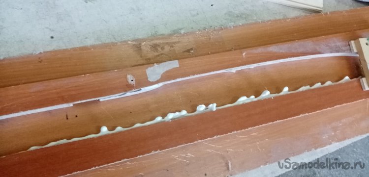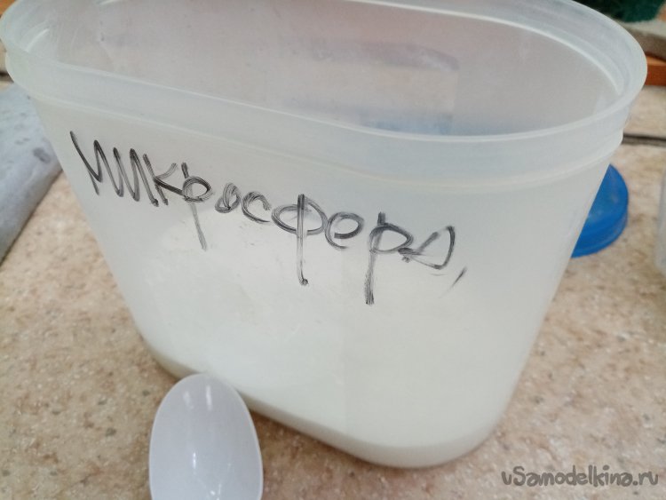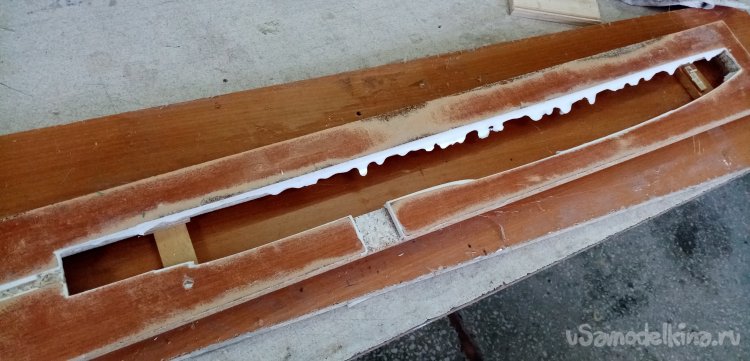 Оставшиеся щели между болванкой и опалубкой заливаем специальным составом. Разводим эпоксидную смолу, добавляем микросферу и загуститель. Получается состав по консистенции похожий на густую сметану процентов в пять жирности. Смесь заливаем в шприц и осторожно проливаем все щели. Поскольку густота состава не позволяет ему стекать внутрь, он отлично заполняет промежуток между болваном и плоскостью.