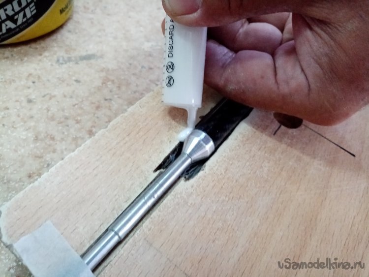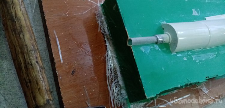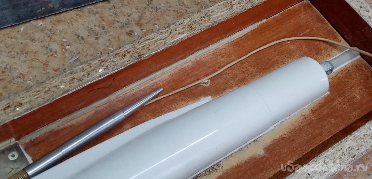 Сошлифовываем бумагу, затем круглыми напильниками, рашпилями выбираем полукруглую канавку для укладки хвостовиков болванки фюзеляжа. Операция очень ответственная, нужно утопить заготовку ровно на половину диаметра.