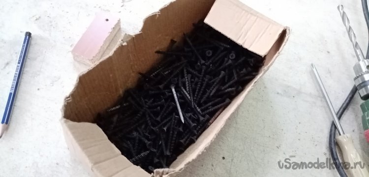 Закрепляем вертикальные стенки на шурупах по дереву. Для удобства работы мобилизовали весь наличный электроинструмент. Парочку дрелей и шуруповерт. В дрели установлены сверла различного диаметра, в шуруповерт крестовая бита. Первое отверстие тонким сверлом под шуруп, второе отверстие глубиной в 16 миллиметров в вертикальной стенке.
