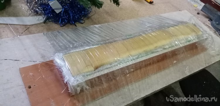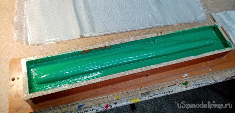 Пока все сохнет, режем по разметке стеклоткань. Из расчета в 18-20 слоев на каждую сторону матрицы.