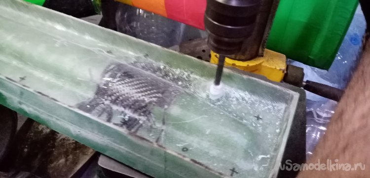 Опять слой гелькоута, пока встает, замешиваем смолу. Встал зелененький, надеваем халаты, перчатки, респираторы, очки и удаляемся в покрасочную, врубив вентиляцию. Еще парочку часов работы в четыре руки и уложена вторая половина формы.