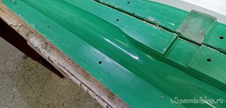Через часик гелькоут наконец встал до нужного значения, смола немного загустела. Одеваем респираторы, перчатки, включаем вентиляцию в покрасочной и работа закипела. Нужно уложить двадцать слоев стеклоткани и пропитать её смолой. Бодро в четыре руки и парой кисточек завершили процесс через два с половиной часа. Вытащили на свет божий в моделку, посмотреть чего наделали.