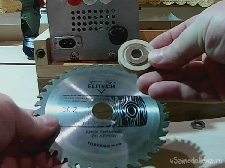 Посадочная шайба для пильного диска выпилена из ламината при помощи коронок по дереву.