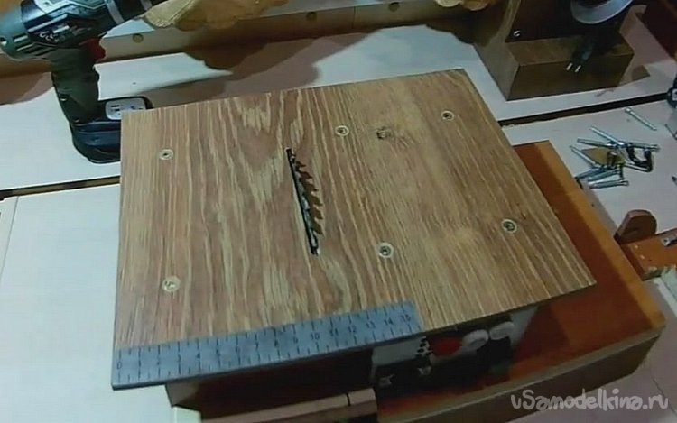 пропилил прорезь в верхнем основании столешницы пильного модуля.