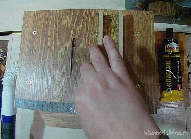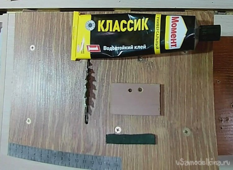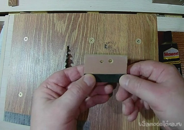 Механизм фиксации сделан из обрезка ламината с наклеенным кусочком кожи,
