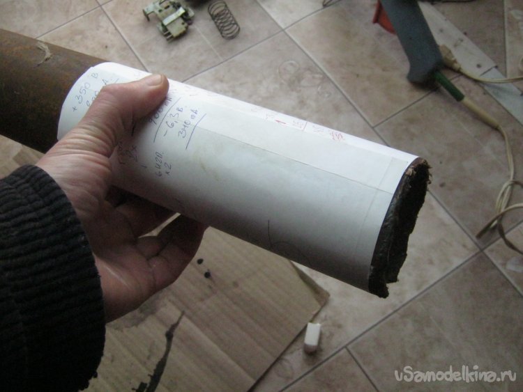 У имеющегося куска трубы выровнял торцы – разметил остро заточенным мелком и обрезал болгаркой. Для разметки использовал ровный лист бумаги – плотно обернув его вокруг трубы и добившись совпадения краев можно надеяться и на ровность образовавшегося торца (Фото 3). Для трубы Ø76 мм достаточно листа формата А4.