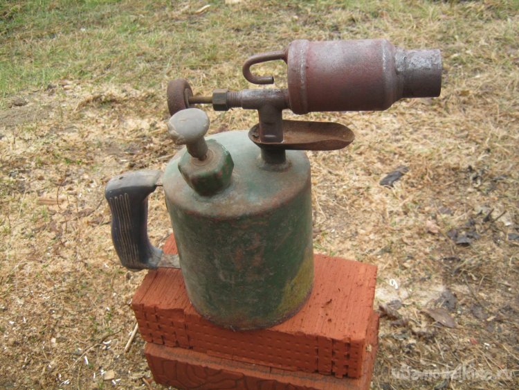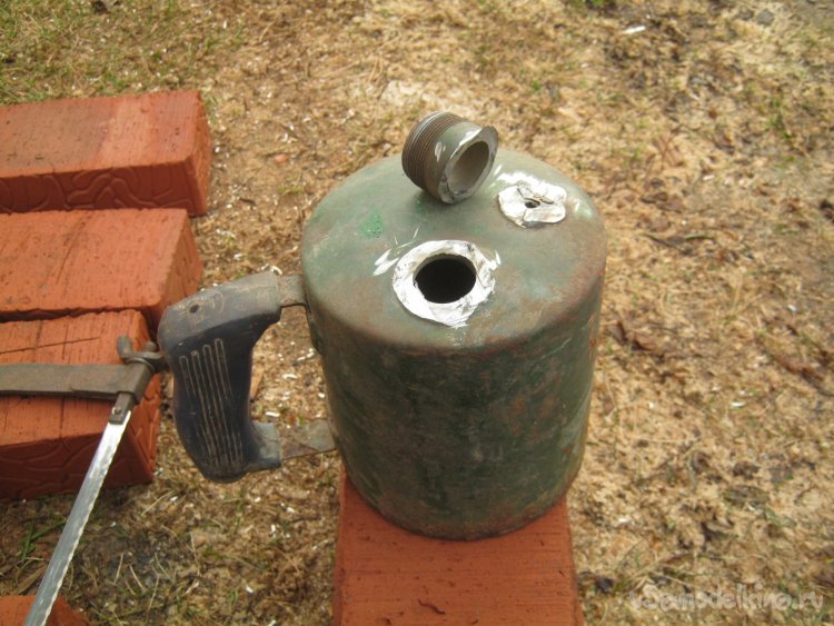 Горловину для колоны позаимствовал у старой паяльной лампы не лучшей конструкции (Фото 4) – запорный вентиль у нее установлен перед испарителем – после перекрытия крана лампа еще долго горит и плюется пламенем. Лампу разобрал, тонким диском УШМ срезал нужное с крышки бачка (Фото 5).