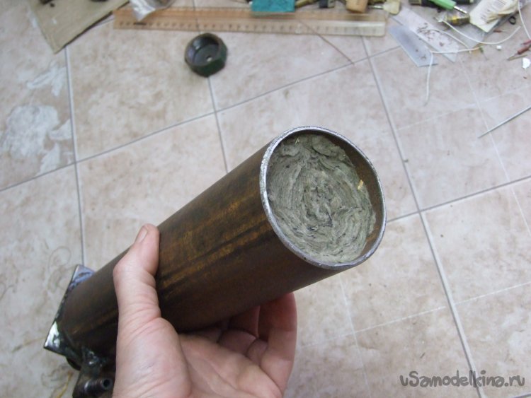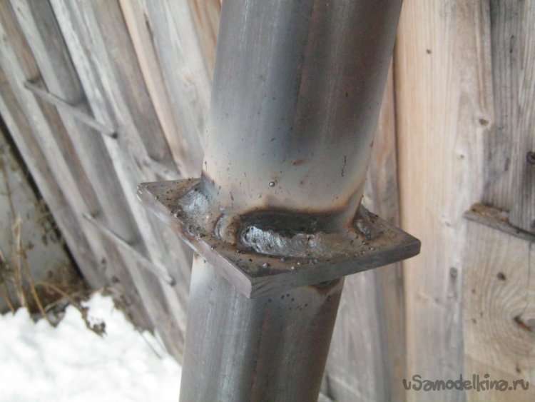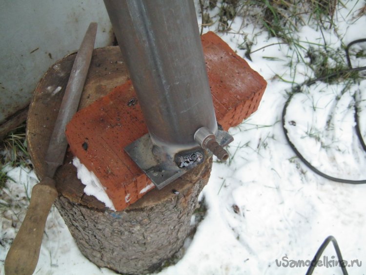 Сделал большое отверстие для жесткого выходного патрубка, подогнал к нему недлинный отрезок стальной трубы диаметром 3/4”, вварил.